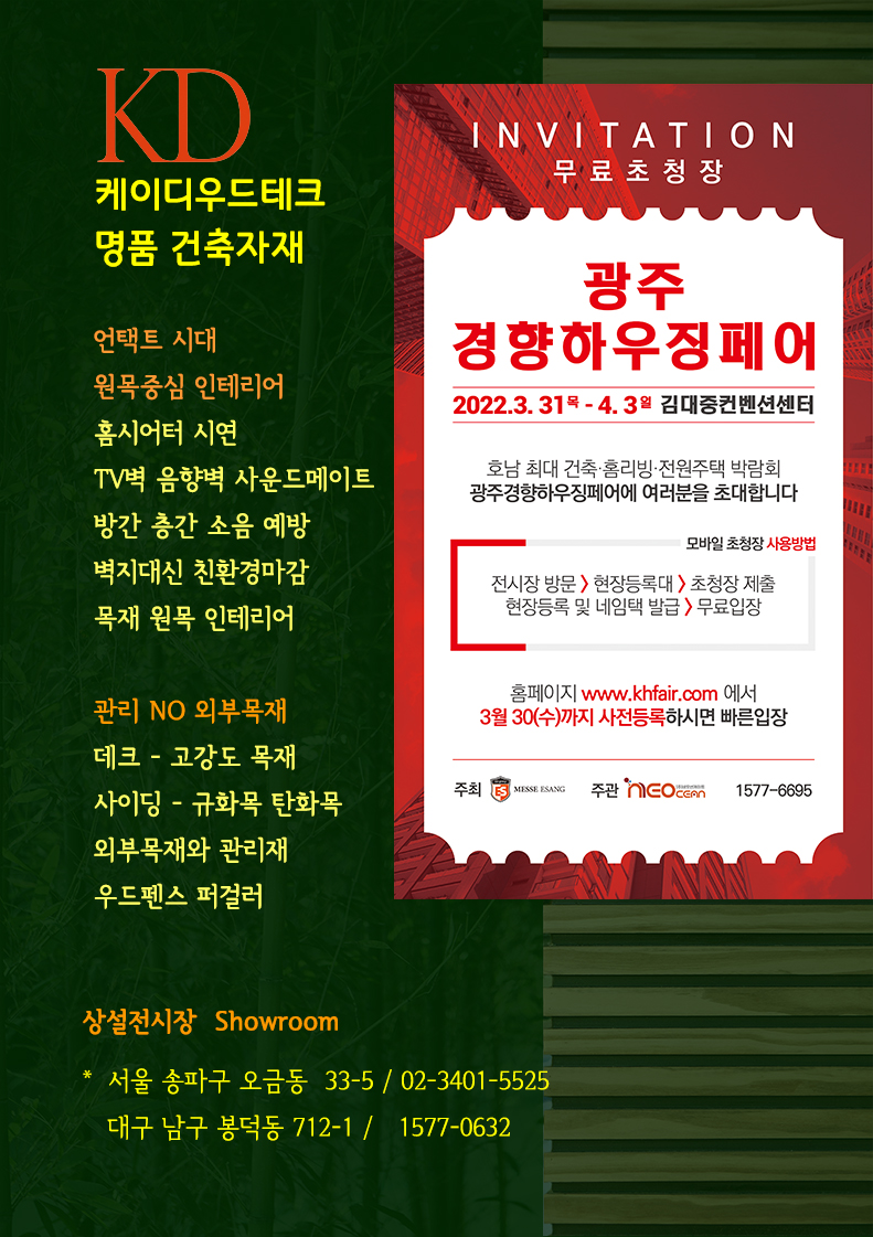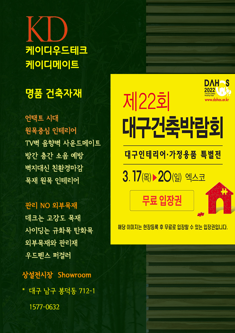 #대구건축박람회 #건축박람회_무료초대권 #케이디메이트 #케이디우드테크 #음향인테리어​#건축박람회 #엑스코 #사운드메이트 #TV벽방음벽 #거실인테리어 #벽지대신_오동나무_라이너루버 #탄화목 #방음벽 #탄화목 #규화목 #원목루버 #편백나무 #프라임우드 #골드우드_데크 #매직픽스_데크시공 #밀보드_고재데크 #편백나무_조습보드 #오동나무_인테리어 #원목루버 #템바루버 #미가참숯루버 #플라스틱루버 #원목루버 #고품격인테리어 #벽지대신원목루버 #템바보드 #텐바보드 #오동나무루버 #인테리어마감재 #루버 #리모델링#동사무소인테리어 #케이디우드테크 #케이디메이트 #프라임우드 #건축자재전시장 #친환경마감재 #지구온난화예방