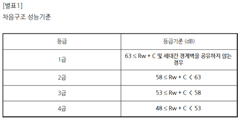제3조(성능기준) 건축물에 사용하는 차음구조의 경계벽 및 간막이벽은 별표1에서 정하는 기준 이상의 차음성능을 확보하여야 한다.