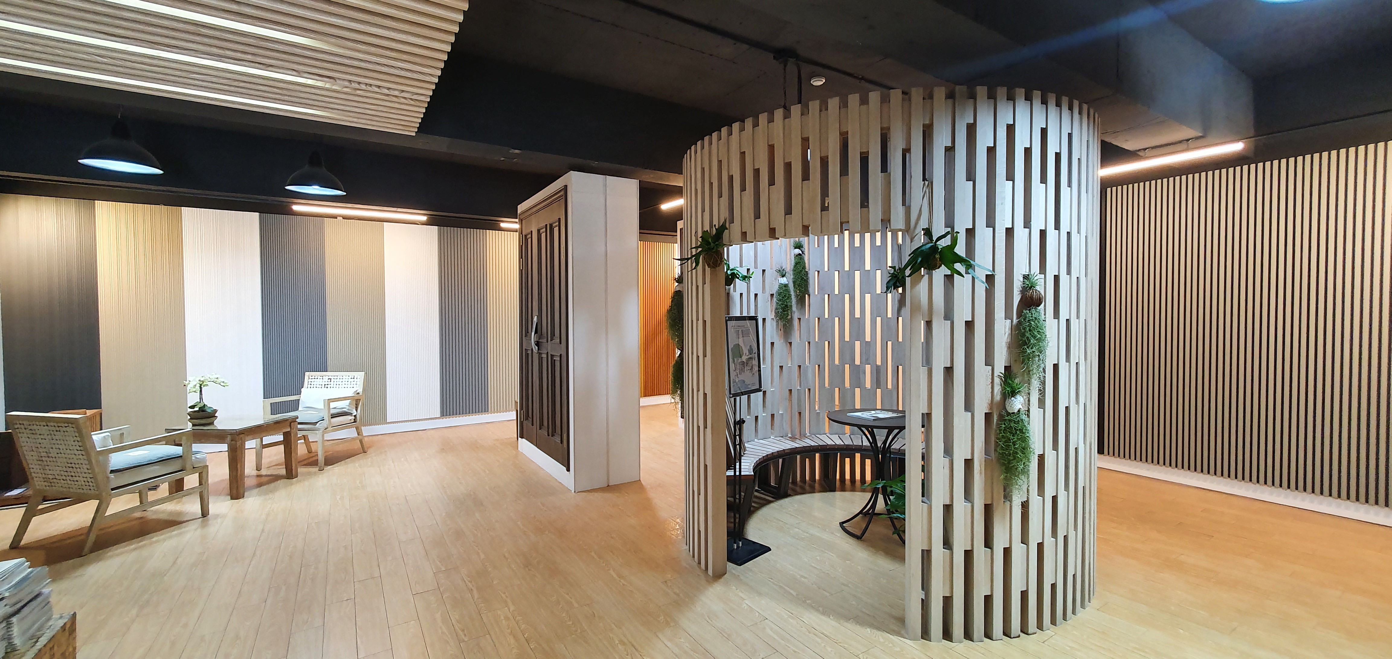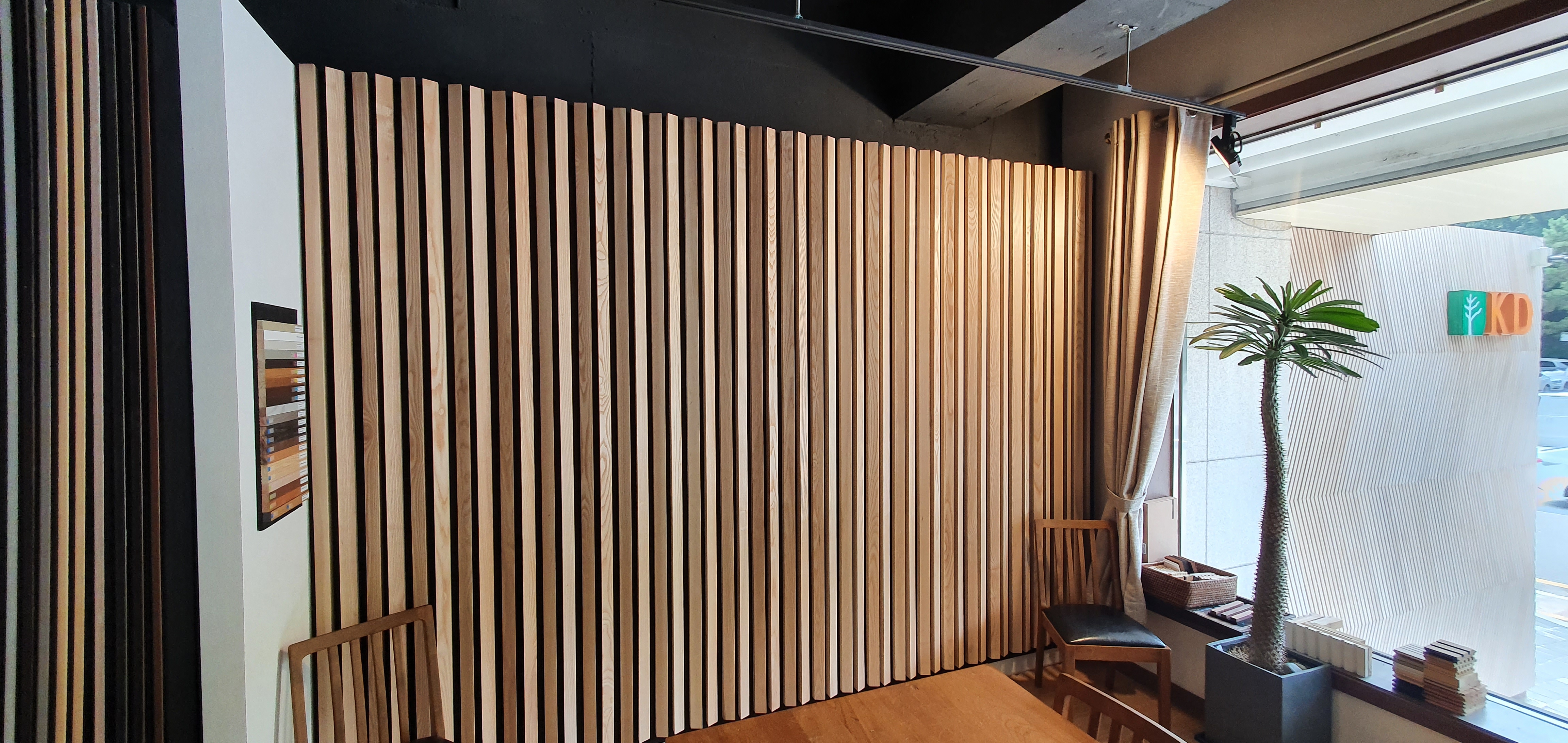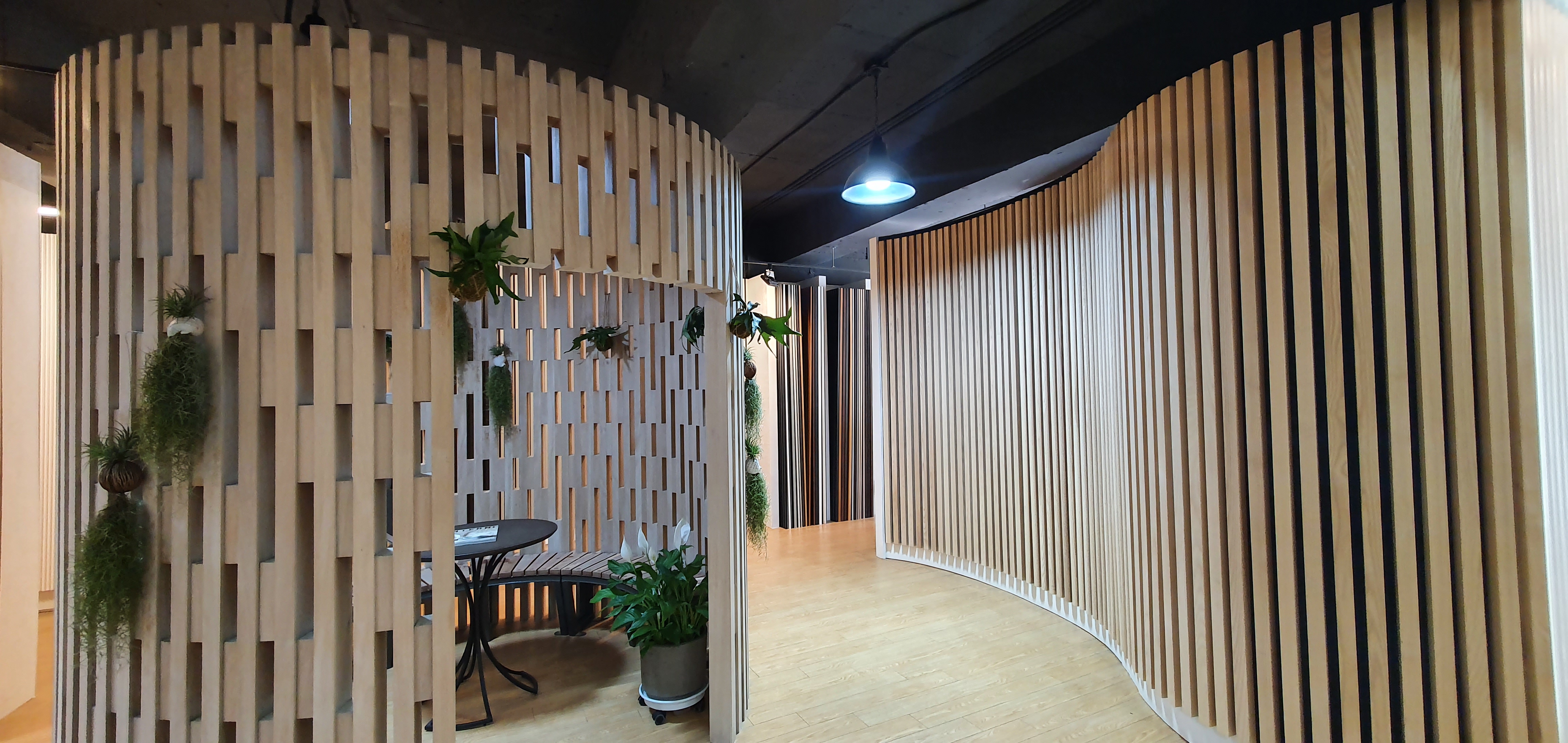 행복움막 우드세움 우측으로는  곡면 방음벽 크리루버 시스템으로 시공된 솨이트 애쉬 가 전시되어 있습니ㅡㅏ.