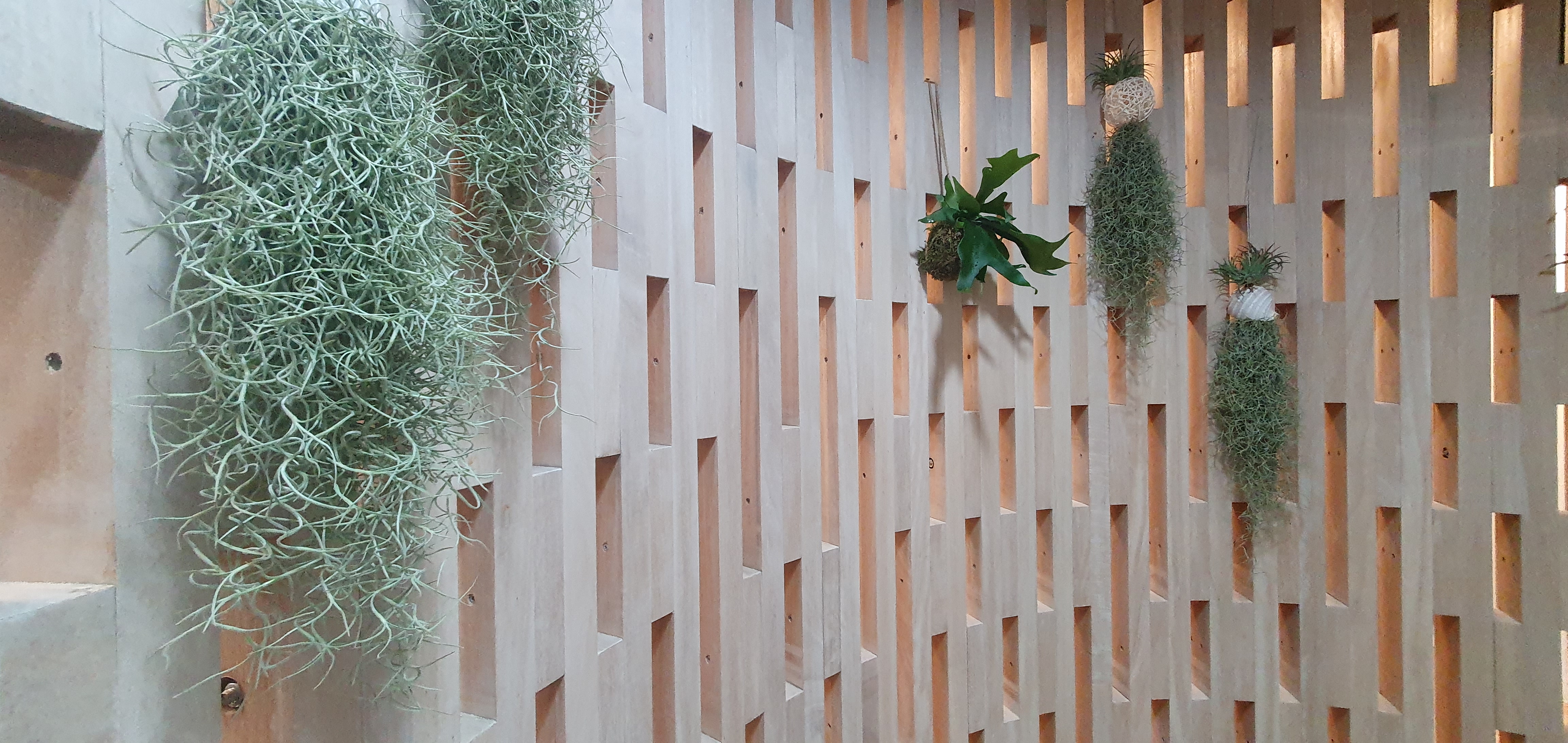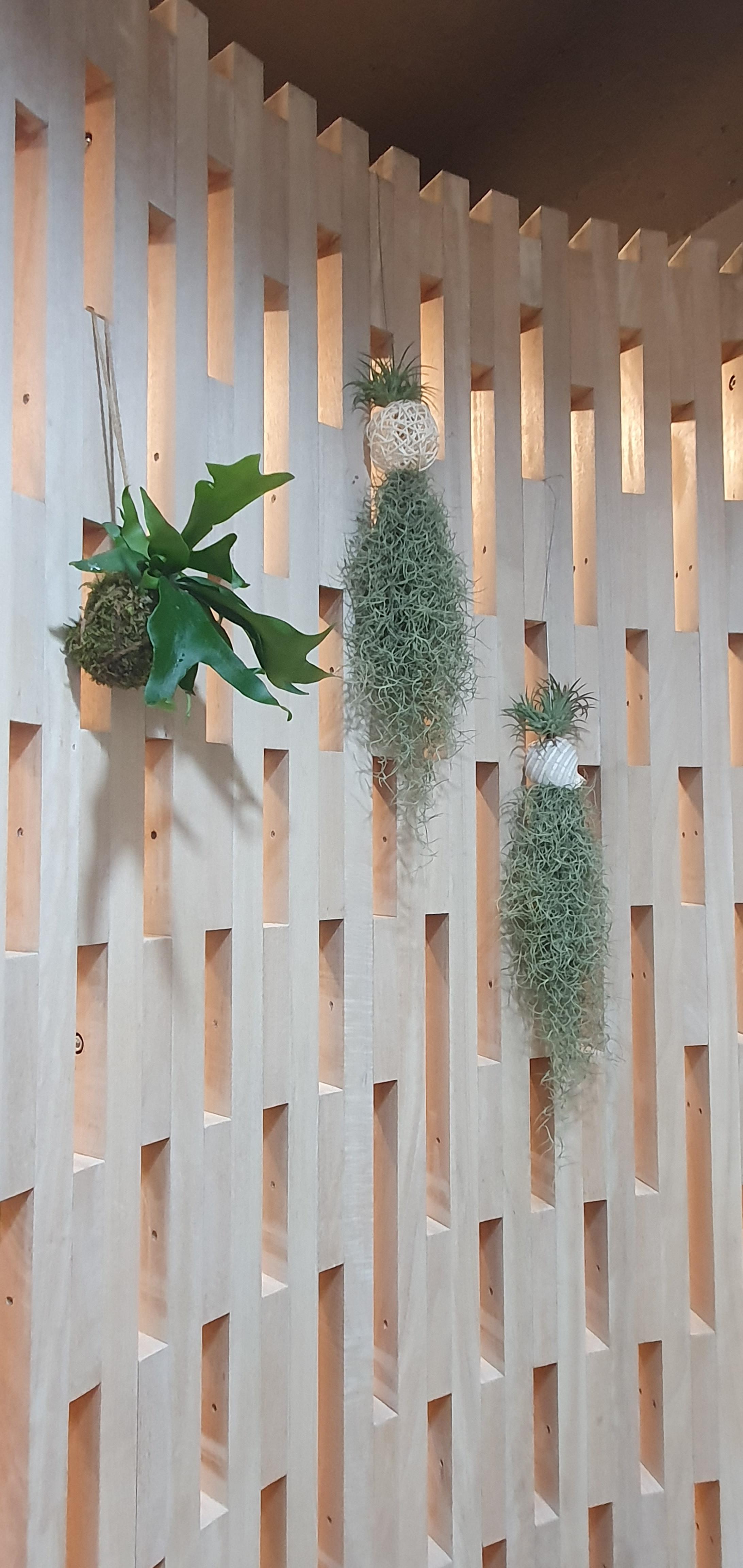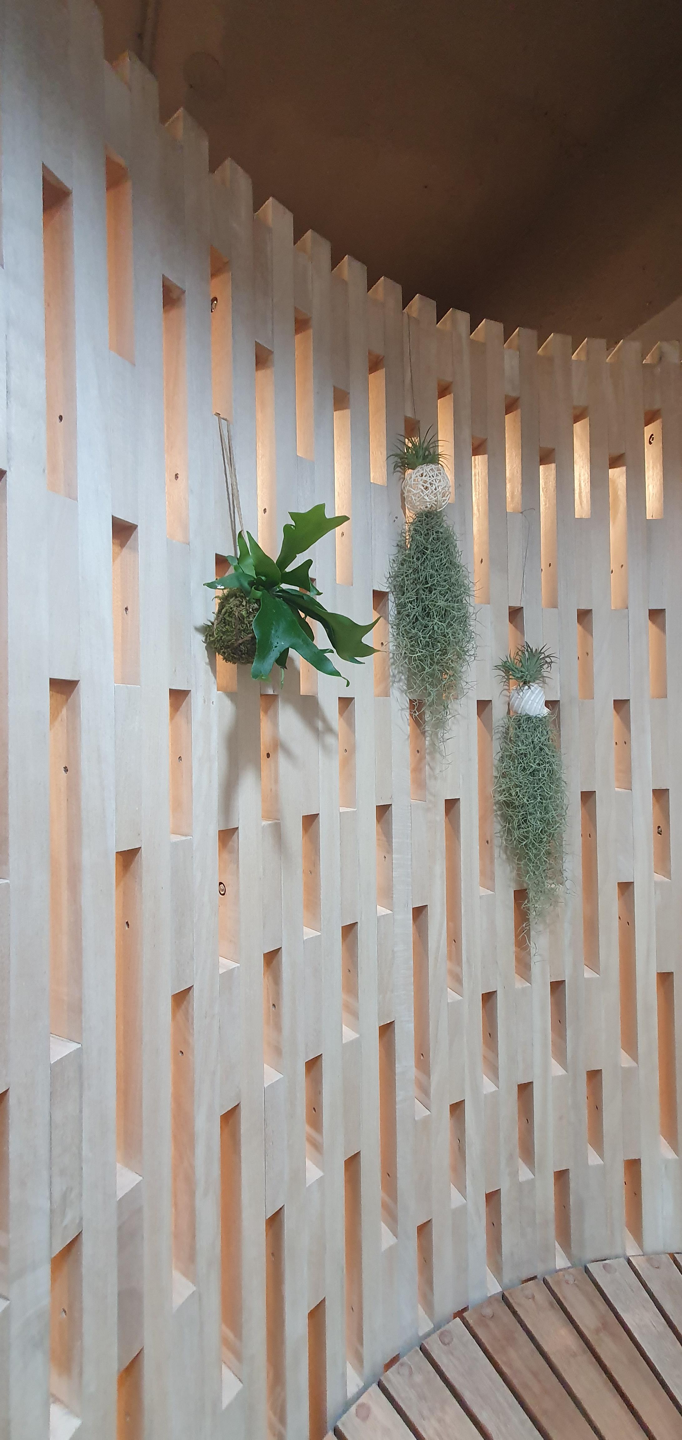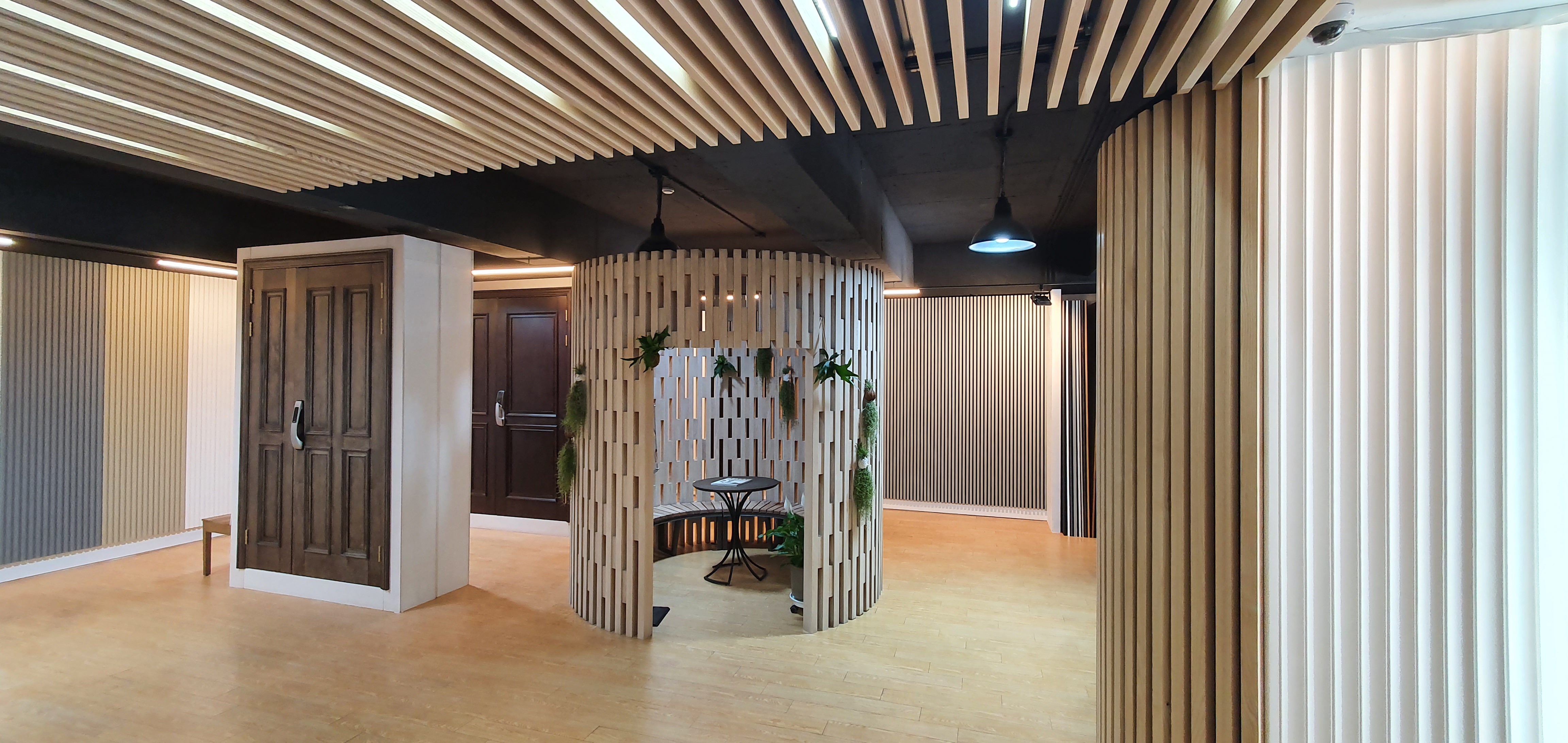 행복움막 우드세움 우측으로는  곡면 방음벽 크리루버 시스템으로 시공된 솨이트 애쉬 가 전시되어 있습니ㅡㅏ.