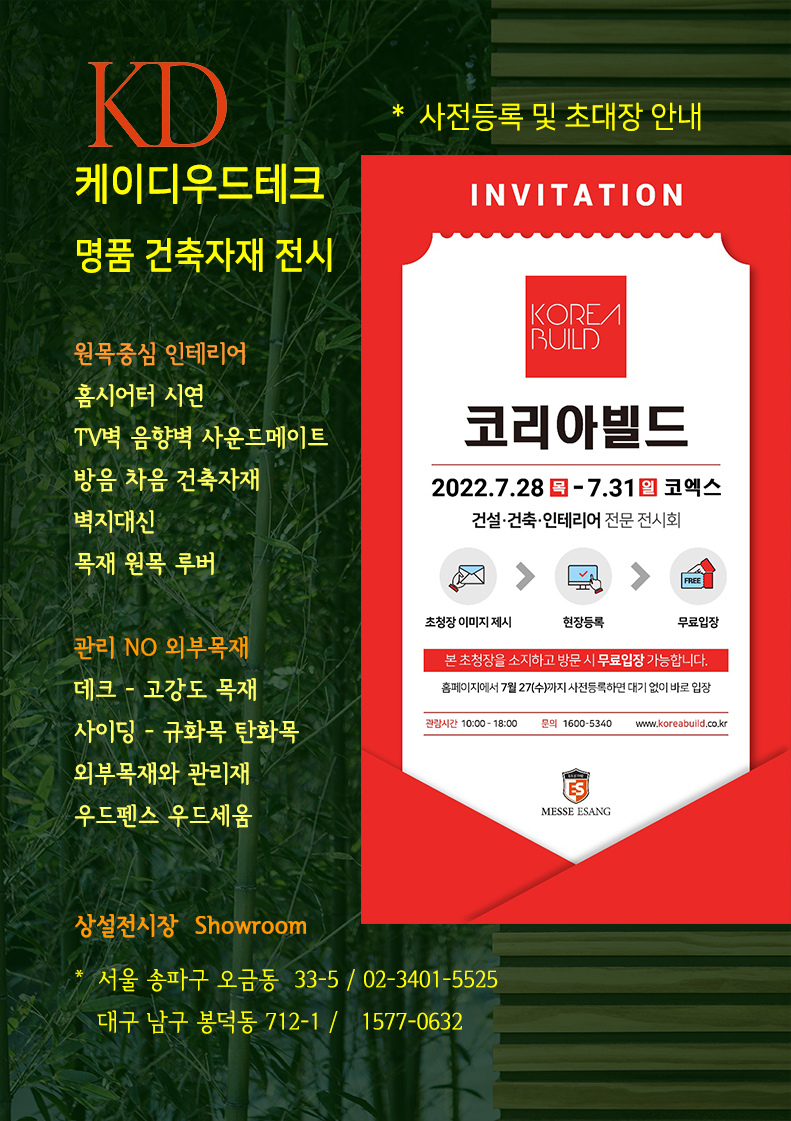 #건축박람회무료입장 #방음공사 #백향목_전시 #음향공사 #음향패널 #광주경향하우징 #코리아빌드 #경향하우징페어 #건축박람회_무료초대권 #음향인테리어#건축박람회 #사운드메이트 #TV벽방음벽 #거실인테리어 #벽지대신_오동나무_라이너루버 #탄화목 #방음벽 #탄화목 #규화목 #원목루버 #편백나무 #프라임우드 #골드우드_데크 #매직픽스_데크시공 #밀보드_고재데크 #편백나무_조습보드 #오동나무_인테리어 #원목루버 #템바루버 #미가참숯루버 #플라스틱루버 #원목루버 #고품격인테리어 #벽지대신원목루버 #템바보드 #텐바보드 #오동나무루버 #인테리어마감재 #루버 #리모델링#동사무소인테리어 #케이디우드테크 #케이디메이트 #프라임우드 #건축자재전시장 #친환경마감재