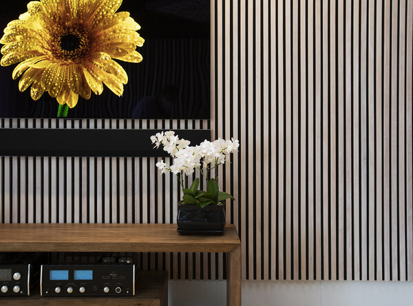 가장 먼저 소개하고 싶은 제품은 어쿠스틱 보드패널인데, 이 제품은 TV 시청에 최적화된 가정용 음향 패널이다. TV를 설치하는 거실 벽면을 타깃으로 하며, 디자인과 음향을 모두 사로잡은 제품으로, 보기에는 좋지만 음향적으로는 좋지 않은 석재로 만든 아트월을 대체하면 좋은 효과를 거둘 수 있는 제품이다. 특히 월간오디오 독자 분들이 관심을 가지고 살펴볼 만한 제품인데, 본인의 리스닝 룸에 설치하면 음향의 개선은 물론 리스닝 룸의 분위기도 바꿀 수 있을 것이다.